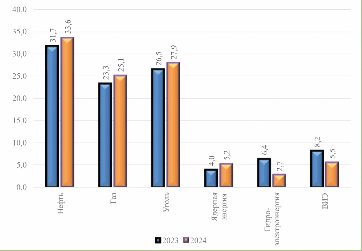 Основными источниками энергии в 2024 году были нефть (33,6%), природный газ (25,1%) и уголь (27,9%), которые в совокупности формируют более 85% мирового энергобаланса. При этом наблюдается постепенное смещение акцентов: доля ядерной энергетики увеличилась с 4% до 5,2%, что отражает рост интереса к низкоуглеродным технологиям и стремление ряда стран диверсифицировать энергопоставки. Сокращение доли гидроэлектроэнергии (–3,7%) и возобновляемых источников (–1,7%) указывает на замедление темпов их развития в глобальном масштабе. Это может быть связано как с ограниченными природными условиями (например, засухами, влияющими на гидрогенерацию), так и с инвестиционными и технологическими барьерами в сфере ВИЭ.