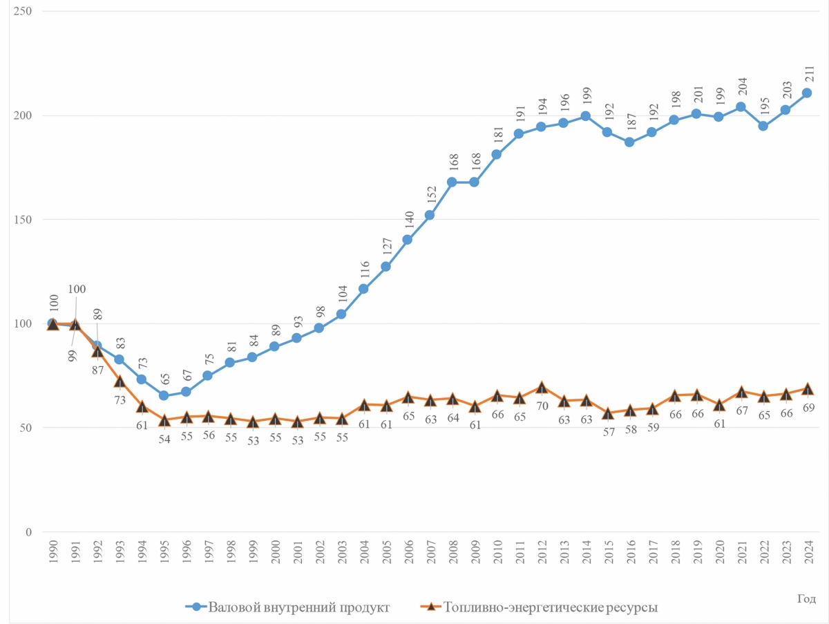 Траектория развития Беларуси с 1990 года демонстрирует уникальный эффект абсолютного декаплинга: экономический рост (ВВП — 211% к уровню 1990 года) достигнут на фоне снижения — 69% — потребления ТЭР (рисунок 2).