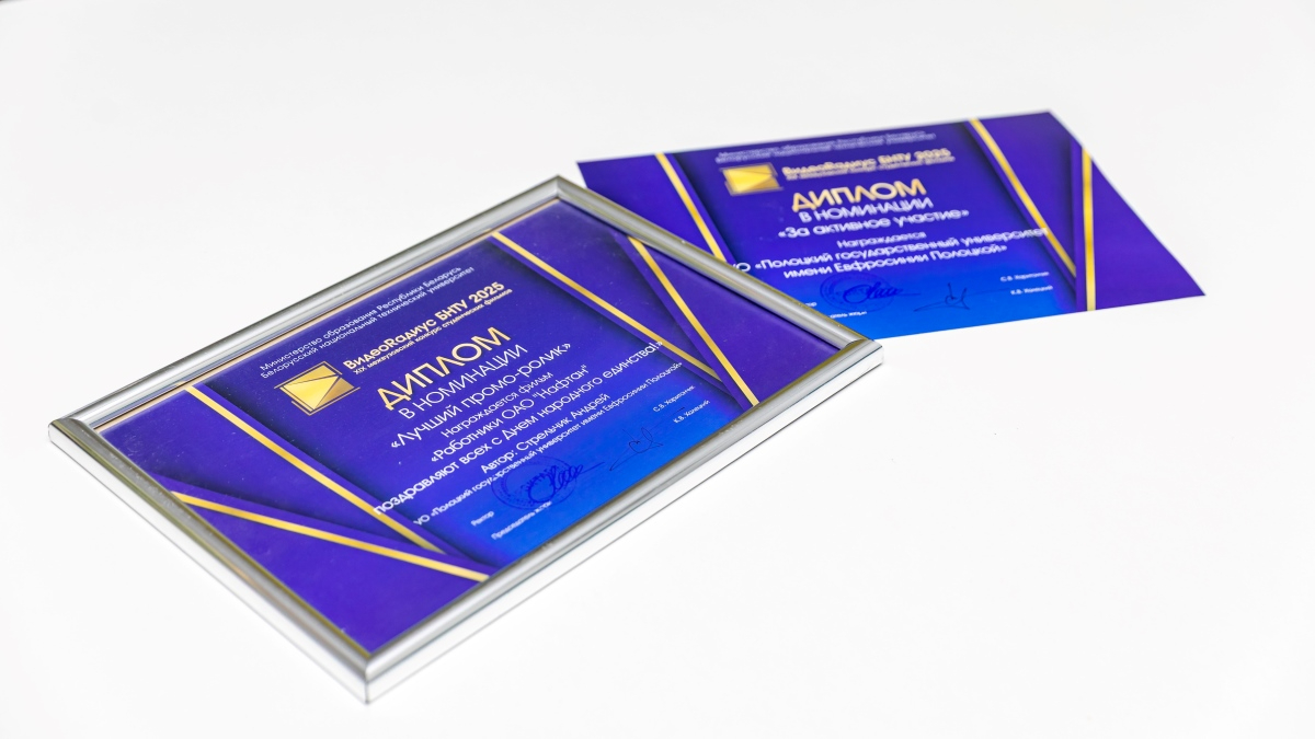 Видеопроект «Работники ОАО «Нафтан» поздравляют всех с Днем народного единства!» победил в XIX Межвузовском конкурсе студенческих фильмов «ВидеоRадиус БНТУ — 2025». Диплом в жанровом разделе «Лучший проморолик» вручен автору — студенту 4 курса факультета информационных технологий Полоцкого государственного университета имени Евфросинии Полоцкой Андрею Стрельчику.