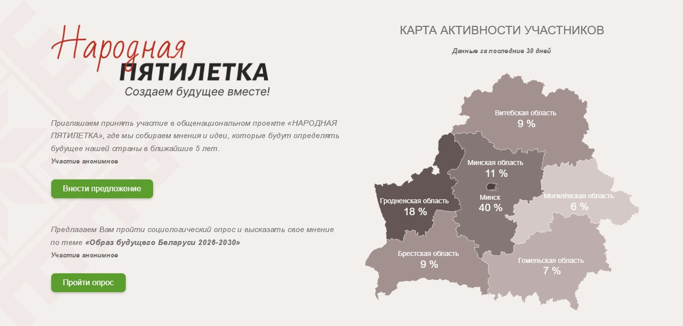 Всем желающим предлагается присоединиться к проекту и высказать мнение по теме «Образ будущего Беларуси 2026 — 2030», а также внести предложения, которые будут определять будущее нашей страны в ближайшие 5 лет.