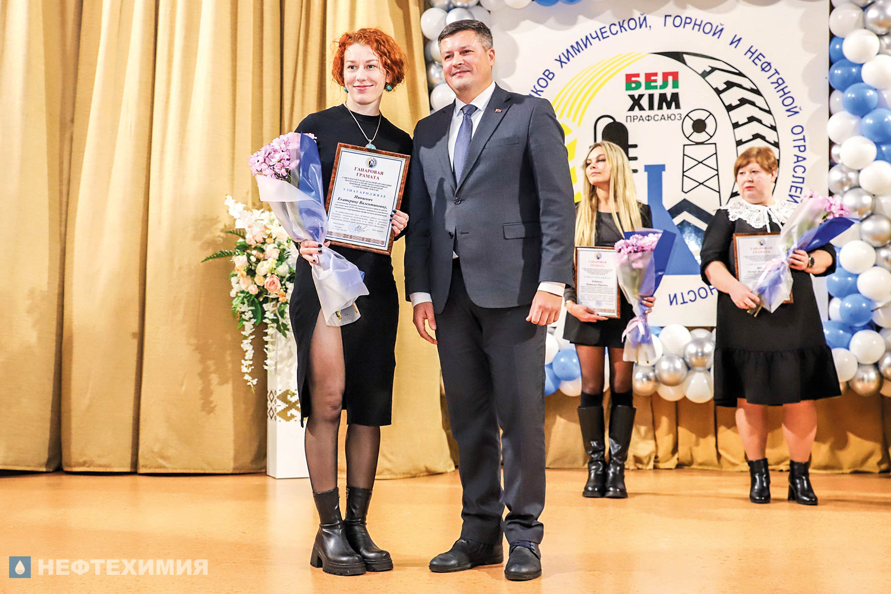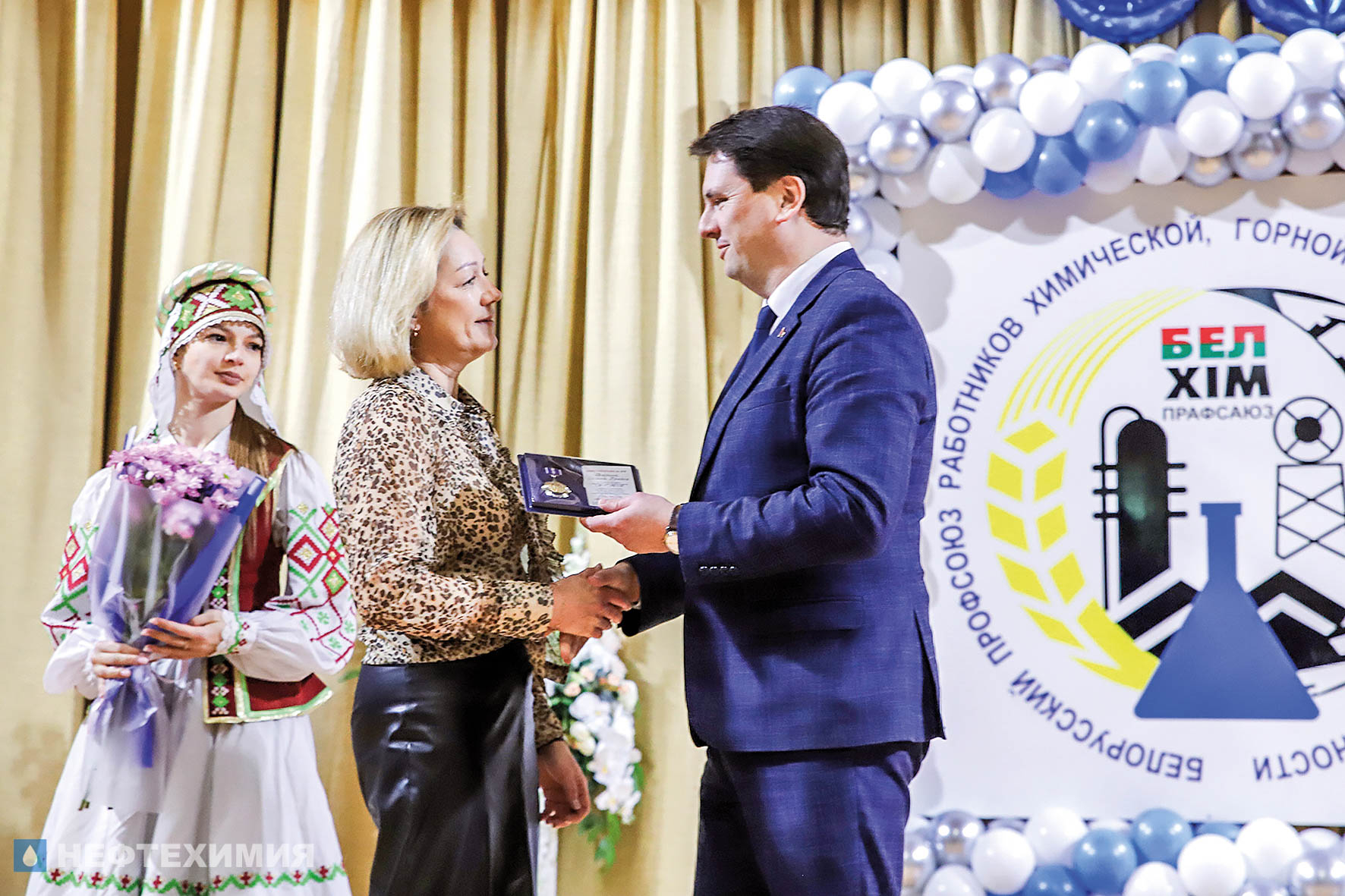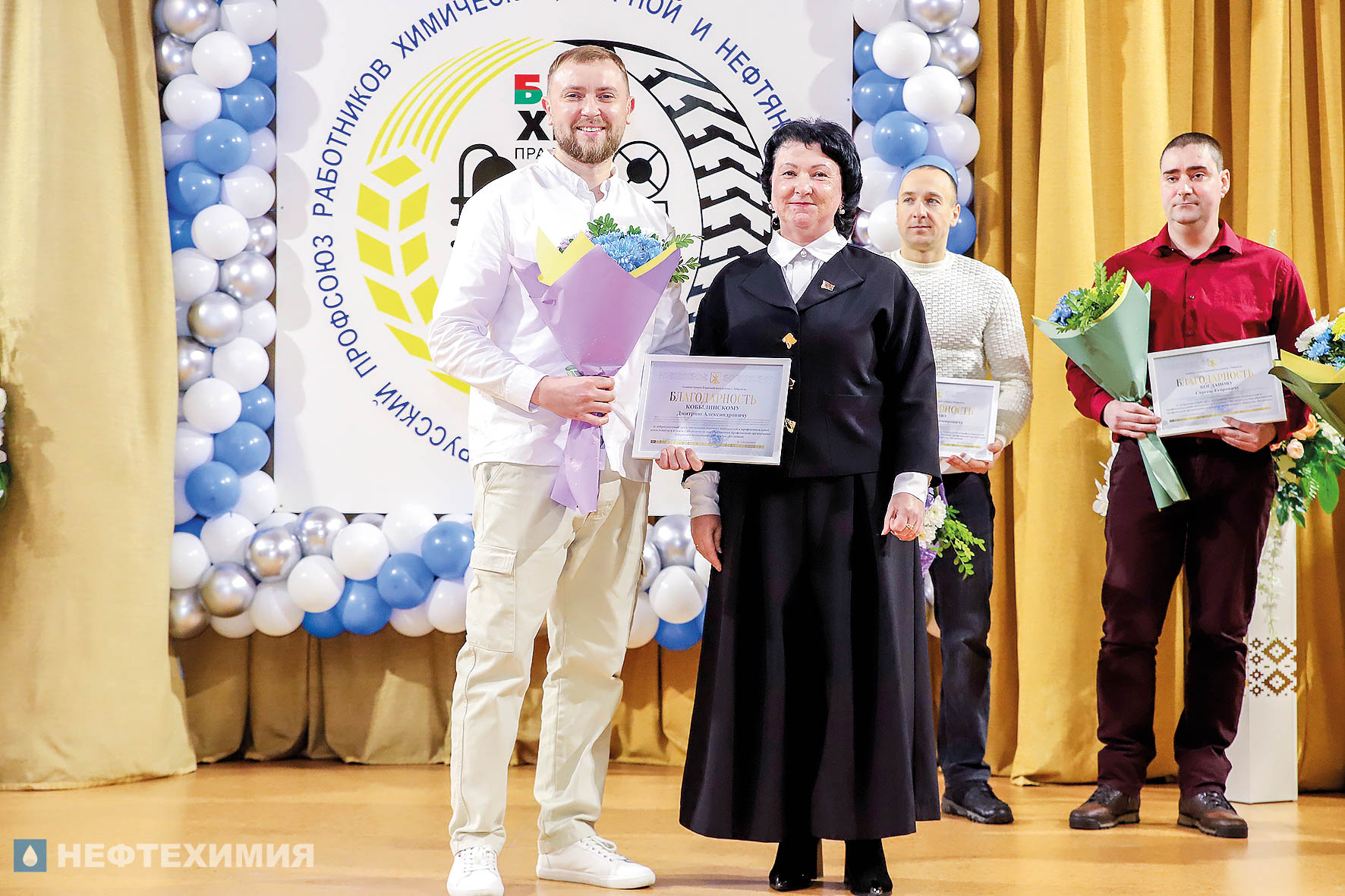 О преемственности поколений и сохранении традиций говорили и почетные гости торжества. Приветственный адрес от председателя Белхимпрофсоюза Андрея Жука зачитал его заместитель Сергей Стром и вручил Почетный диплом профсоюзной организации «Белшины», а Почетный знак РК Белхимпрофсоюза «За заслуги перед профсоюзом» — специалисту по организационной работе и документообеспечению профкома предприятия Оксане Печериной.