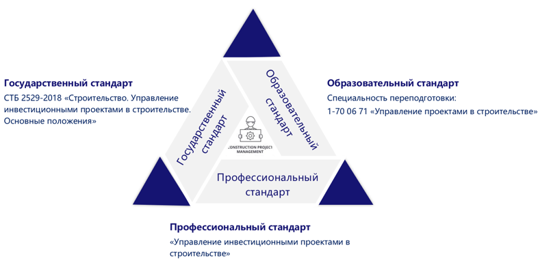 Следующим шагом стало появление специальности переподготовки руководящих работников и специалистов с высшим образованием именно для строительной отрасли в развитие первичной межотраслевой должности «Руководитель проекта». Так, специальность переподготовки 1-70 06 71 «Управление проектами в строительстве» с присвоением квалификации «руководитель проекта в строительстве» появляется в Общегосударственном классификаторе Республики Беларусь ОКРБ 011-2009 «Специальности и квалификации», утвержденном постановлением Министерства образования Республики Беларусь от 2 июня 2009 года № 36. Этот документ становится одним из столпов триады стандартов по управлению проектами.