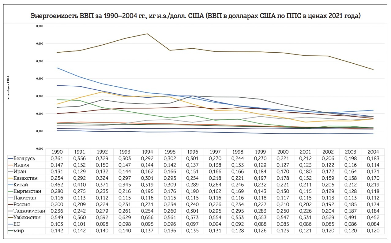 В этом контексте представляет интерес анализ уровня энергоэффективности государств — членов ШОС в сопоставлении с показателями Европейского союза (ЕС) и среднемировыми значениями.