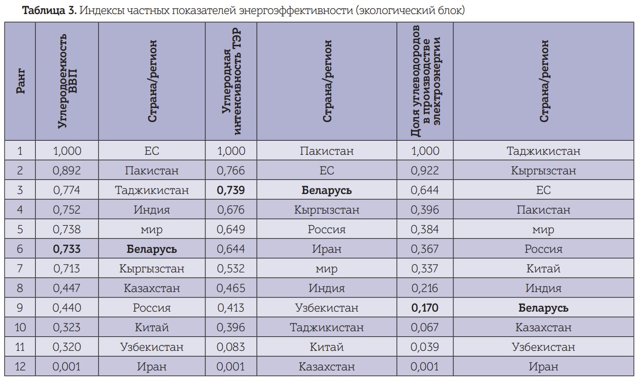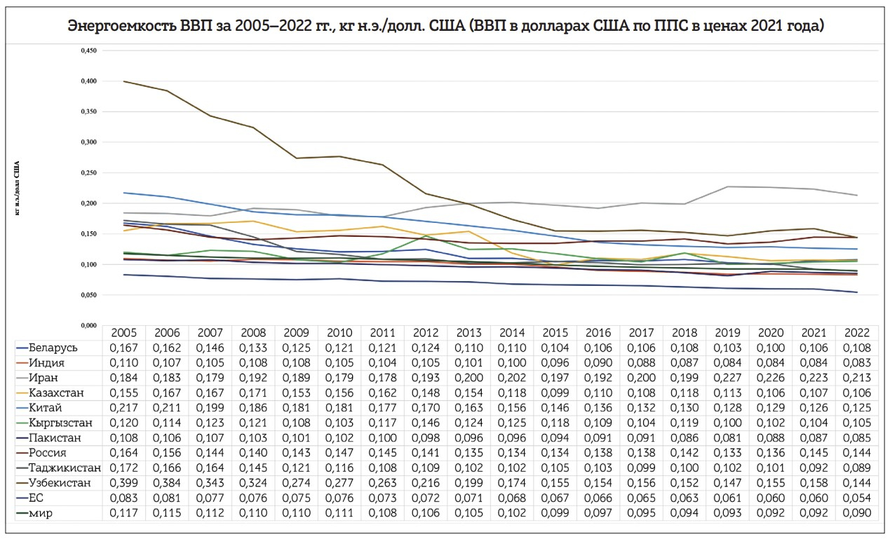 Согласно таблице 2 по уровню энергоемкости ВВП лидирует Европейский союз. За ним следуют Индия, Пакистан и Таджикистан, демонстрируя более высокую энергоэффективность по сравнению со среднемировым уровнем. В нижней части рейтинга расположились Кыргызстан, Казахстан, Беларусь, Китай, Узбекистан, Россия и Иран.