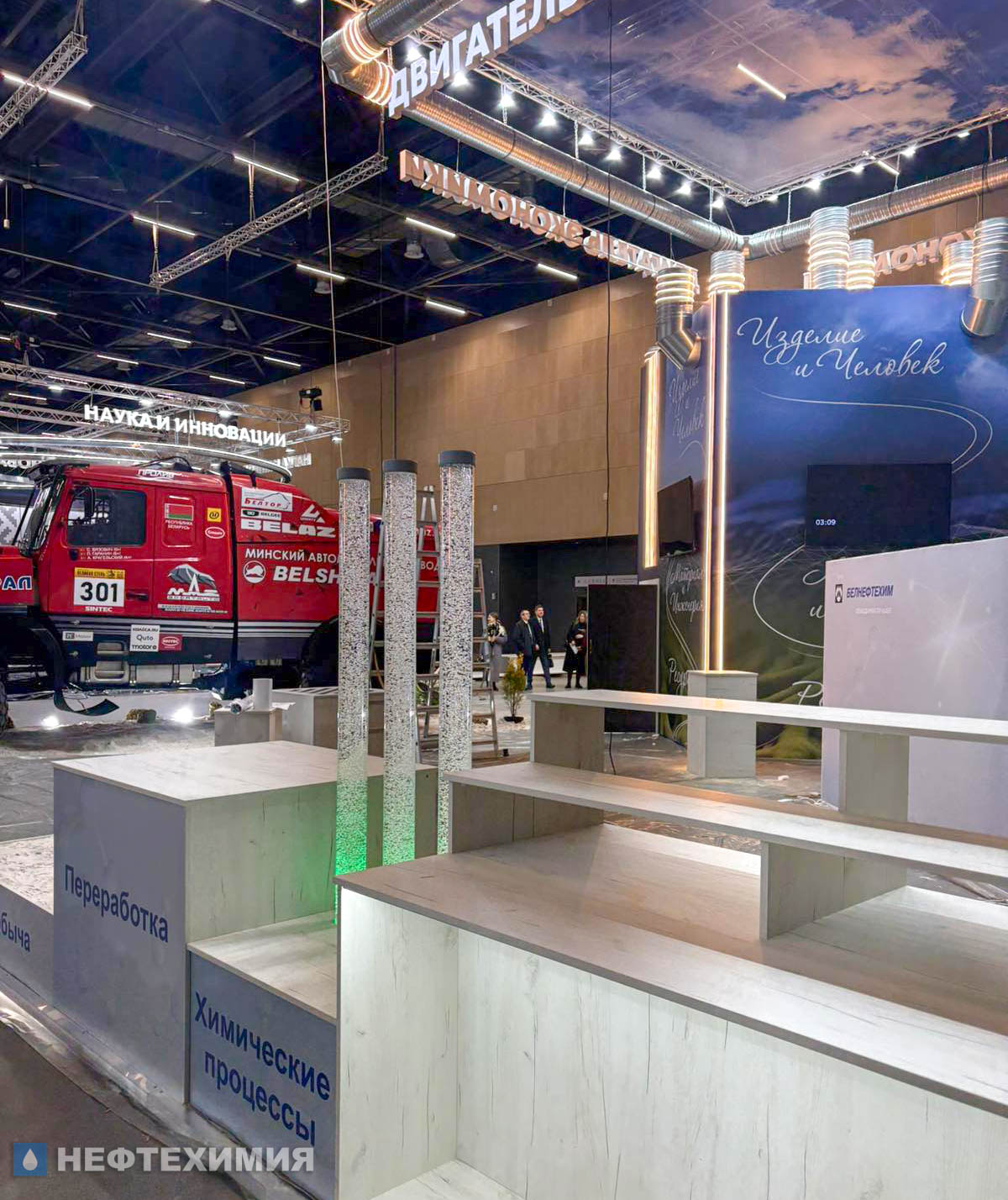 В большом зале ММВЦ разместится ключевой экспозиционный блок — восемь крупных локаций, посвященных флагманским отраслям национальной экономики, включая нефтехимическую. В эти дни в залах идут последние приготовления к открытию, оформляются стенды, новогодним декором украшаются стойки с презентационными материалами и образцами продукции.