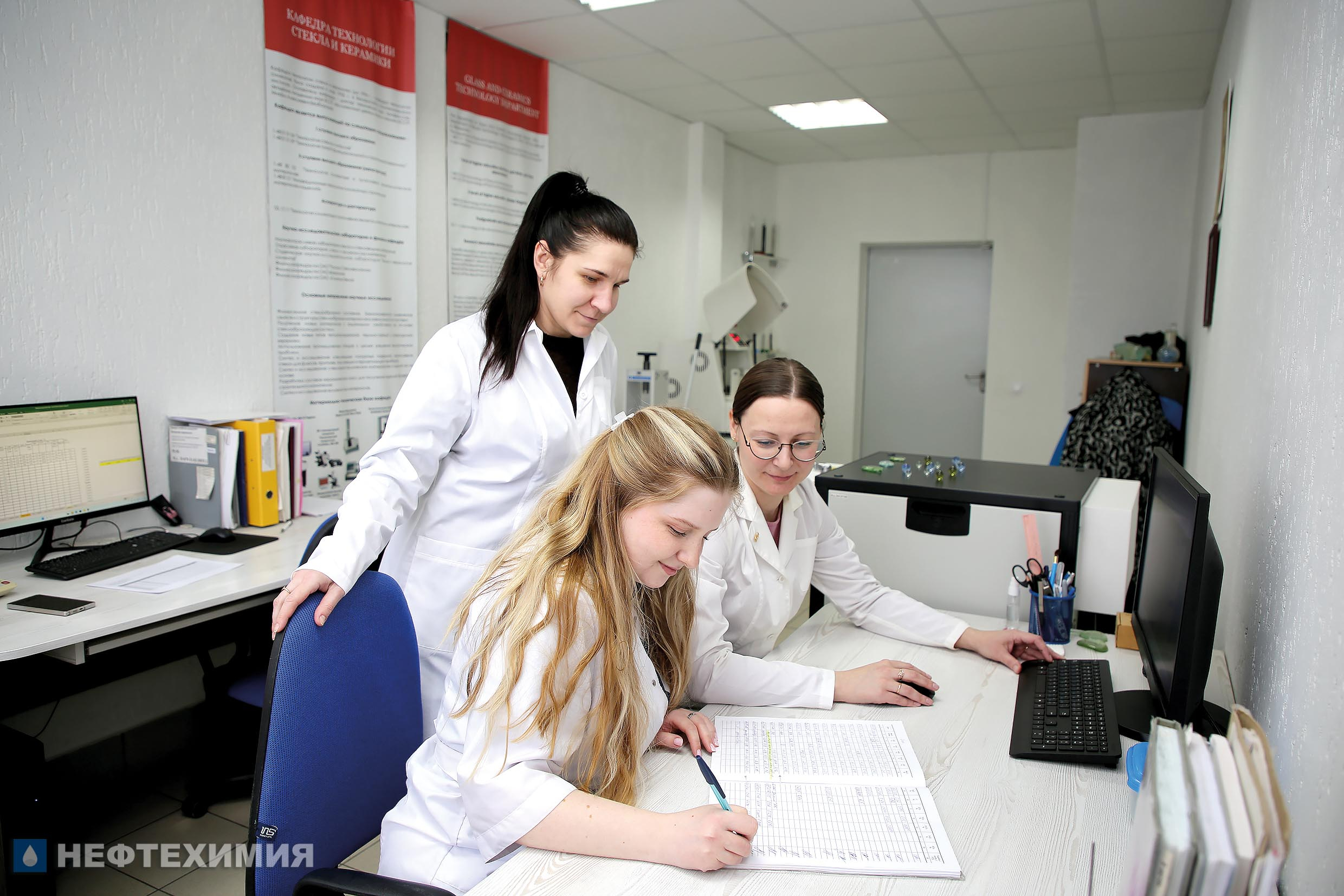 В отраслевой лаборатории стекла и волокнистых материалов работают Юлия Ступчик, стажер младшего научного сотрудника БГТУ Алеся Лазарь и ведущий химик лаборатории управления качества ОАО «Полоцк-Стекловолокно» Юлия Горохова